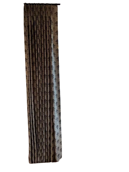 These custom Schumacher single window drapery panels feature interlining with blackout lining and tacked-top pleat.